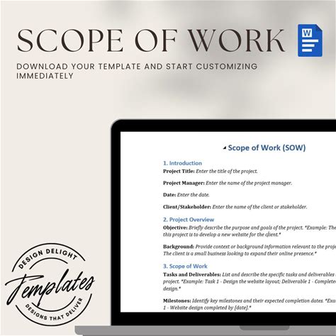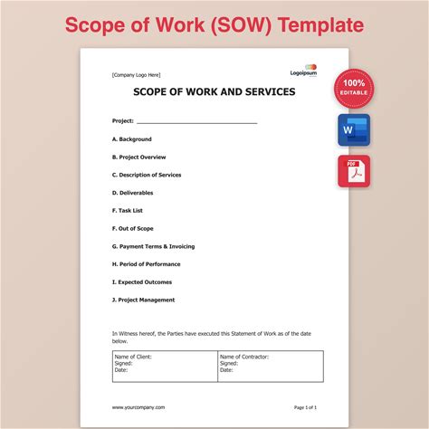 Professional Scope Of Work Template - Editable & Customizable, SOW Template, Project Management, Vendor Contract, Project Scope, MS Word