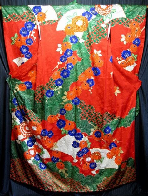 Vintage Silk Furisode Kimono: Japanese Wedding Robe With Floral Pattern